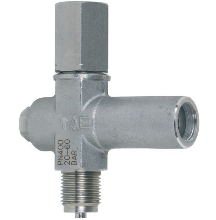 The overpressure protector consists of a spring loaded piston valve.