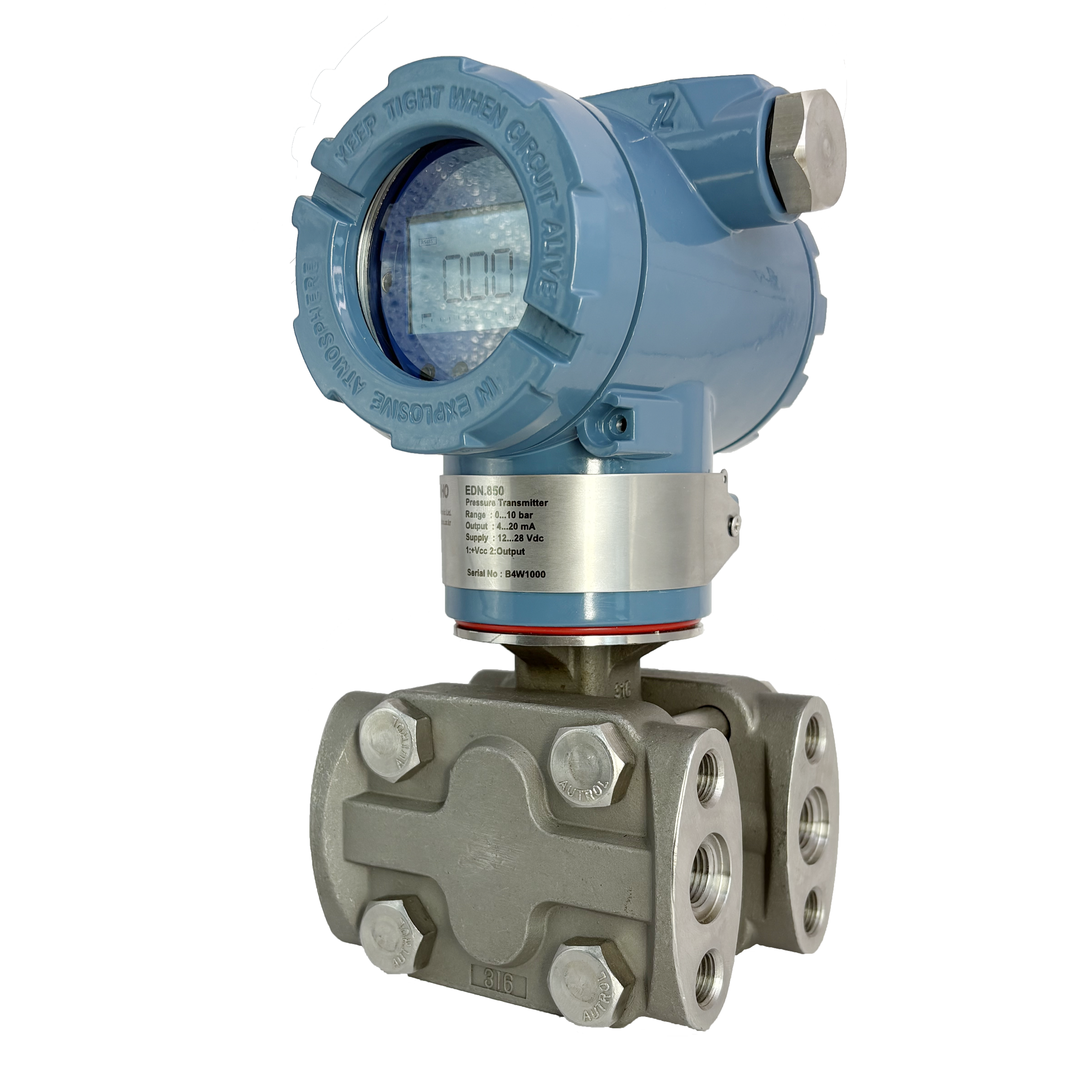 The EDN.850 Differential Pressure Transmitter is equipped with an LCD window featuring a white backlight for enhanced visibility. The housing is made of aluminum, and all wetted parts (the components in contact with the measured media) are constructed from stainless steel, ensuring excellent chemical resistance under most operating conditions except for certain special fluids.